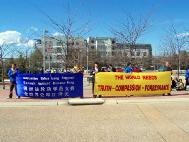 学员在外交部大楼外和平的炼功和发正念,新闻发布会于12点左右开始。