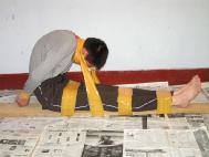 酷刑方法:被迫害的法轮功学员两腿被固定在梯子上,这里由于材料所限,用木板代替了梯子。口被封条封住是怕学员叫喊,手也被捆住,然后把脑袋强行压向腿面用胶带固定住。