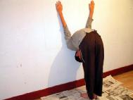 如图所见,法轮功学员上身被强力的压下去顶在墙面上,两个腿比图片上演示的还要靠前,几乎脚趾尖要碰到墙根,这样学员的腿就不自觉的弯曲了,凶犯就用毛巾围到膝盖上,在后面把弯曲的腿拉直,手要坚持不住掉下来的话也被凶犯用手按着继续接受酷刑。