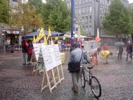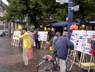 上午十点法轮功学员们在雨中搭起展板,炼功,发资料,没有一个人因为下雨而离开,行人也似乎没有受到天气的干扰,纷纷停下脚步仔细观看图片,和学员们深入交谈。中午雨渐渐的停了,天气越来越好,下午太阳出来了。更多的人被祥和的炼功吸引,人们无法把祥和的炼功人和图片上的残酷联系在一起,震惊之余不断有年轻人睁大了眼睛问:“这是真的吗?”老年的德国人经历过二战,虽然对犹太人迫害的残酷他们永远忘不了,虽然他们知道世界上有这样的残酷和邪恶,但他们还是在图片前神情肃穆的站住脚步,频频摇头。不断有人主动签名。