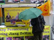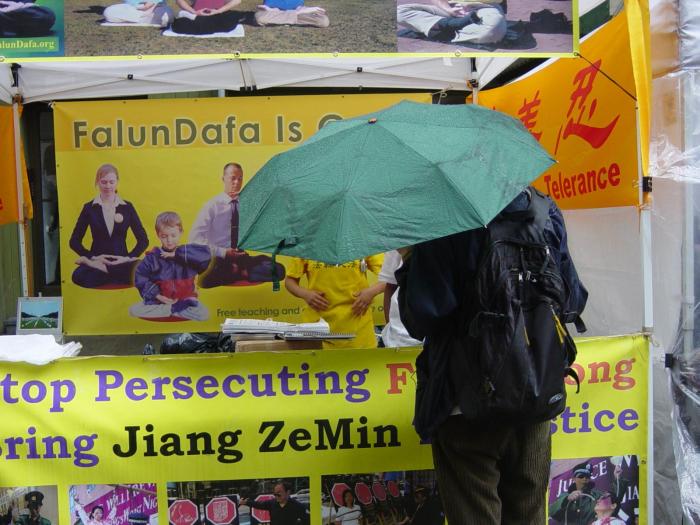我又开始发资料,我总是喜欢与行人直接的交流,喜欢亲自将资料送到他们手上。今天的摊位前有两条横幅,上面一条是英文的“法轮大法好”,这一条尽显修炼的祥和与美好,上面有许多弟子端坐打坐炼功的照片。下面一条是讲迫害,种种酷刑折磨下弟子不成人形的照片十分令人震惊。计算机上也正在放着酷刑展,不要说行人,有好几次我都忍不住泪水盈眶。