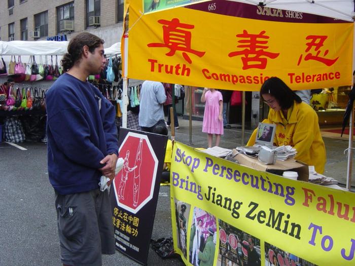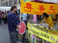 我们带了小蜜蜂,放上了《普度》《济世》的音乐,音乐声引来了匆忙走过的纽约人驻足。若行人匆忙,我就只递上资料,有机会就说几句,没机会就微笑着说一声谢谢。停留时间长的,我就给他们讲法轮功,讲法轮功在中国所受的迫害。有人看了真象展板,听了我的讲述,就主动要求在请愿的表上签名,还有人问我要不要捐款,我说我们不接受捐款,就是想告诉你们真象。
