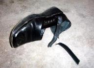 7月6日晚,因我不蹲,十多个人将我按住蹲下(图1),两边的人使劲向下压肩膀,后面的人用力向上拔头部,前面的人卡住我的脖子,下面一边一个人掰住我两腿固定,还有人按住脚使我动不了。左边右边分别有人将我的胳膊抬起别到后面。当时两臂的根部和手腕被掰得象断了一样,脚腕也象是折了,后来四肢麻木失去知觉。被掐住喉咙产生条件反射,恶心、连续呕吐,吐的时候还被卡着,一要出声就恶心,特别痛苦。当时沈阳7月份的气温在30摄氏度以上,监号里地方小人多,关着门不通风,我的衣服、头发全被汗湿透,因为腿向外掰,脚往里别,脚部拧的劲到极限,一小时左右,我脚上穿的皮鞋的拉带(宽一厘米)崩断(图2.注:这只鞋可不是道具,是实物证据)。