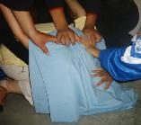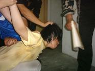 2001年7月10日,我因为连续几天缺少睡眠,头昏昏沉沉的。一大队副大队长李生原来到东三房,站在门口指着我对“帮教”人员喊:“看她这样也不行啊!你们赶快!加紧干!”随后,“帮教”人员砰一下将门关紧,上来一帮人将我按蹲下,双臂被拧在后面举高、掰腿别脚(膝盖向外掰,脚向里掰),用毛巾将我的嘴和鼻堵上(图3),阻止出声和呼吸,抓住头撞水泥地,然后将头部窝進大腿根部位,脸贴到水泥地上,身上的关节和骨头都被按错位了。又拿来被子将我捂上(图4)。
