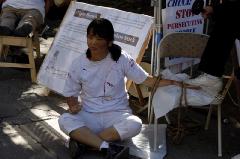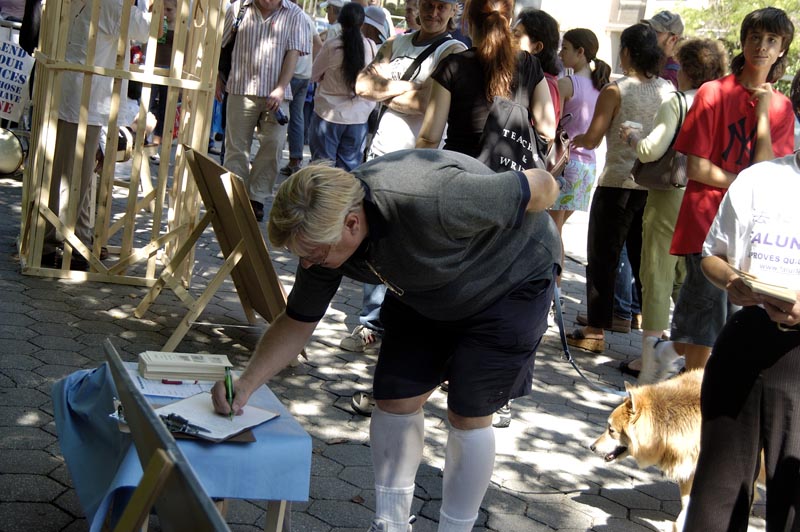纽约的MARCIA DELMAN女士第一次听说迫害,她说:“酷刑令人厌恶、没有人性(DISGUSTING & INHUMAN),令人吃惊的是我们现在生活在这样的世界里还有这种酷刑迫害,迫害别人的人真是有毛病。中国政府(江氏集团)害怕一切,法轮功没什么让它害怕的,(迫害法轮功)毫无道理。”DELMAN说:“我刚刚(在呼吁停止迫害的签名本上)签了名,我会告诉别人(法轮功遭到的迫害),这样消息就传开了,中国政府(江氏集团)会因为用如此愚蠢的酷刑来迫害无辜百姓而在世界上丢脸。”