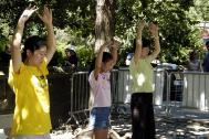 在酷刑展的一侧,几个法轮功学员正在表演功法,其中还有一个十岁的小女孩正在和她妈妈一起炼功。