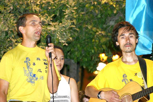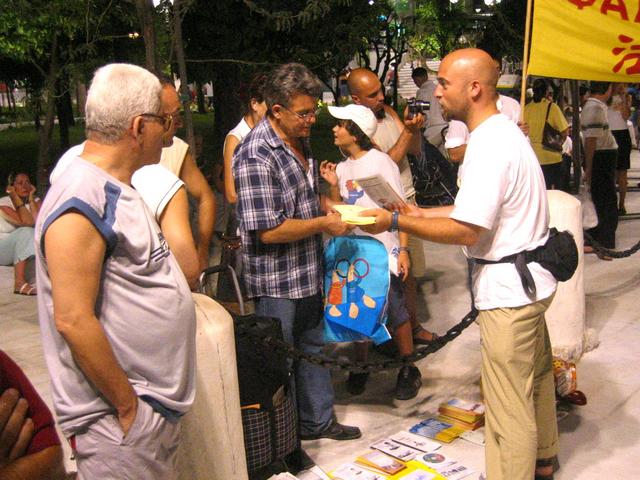 希腊的夏天极为炎热,因此在傍晚气温较为下降的时候,观光客才会外出用餐并且到处逛逛,法轮大法学员也是利用傍晚时分在雅典市的各个区域洪扬法轮大法。由于奥林匹克运动会正在雅典市進行,因此市区充满来自全球各国的人,雅典市中心广场是洪扬法轮功的好场所,因为许多人都会经过那里。