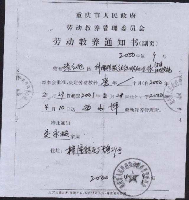 缘圆7个月大时,爸爸张洪旭因坚持修炼法轮功,被国安大队张良送去西山坪劳教所关押了两年,期间鼻梁被狱警打断,牙齿被打掉,肋骨多处受伤。