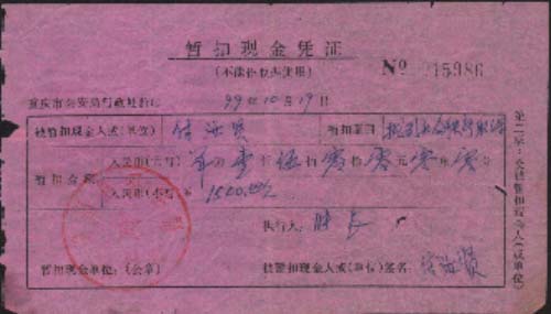 右图是张缘圆的奶奶付汝贤被非法扣押1500元收据,日期是1999年10月19日。