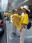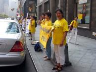 来自不同国家,不同肤色的法轮功学员身着印有“法轮大法好”“停止迫害法轮功”字样的T恤衫,整齐站在人行道的一侧,向过往车辆和行人展示法轮功受迫害的真象横幅,演示五套功法,发真象资料。整个活动持续了2个多小时。