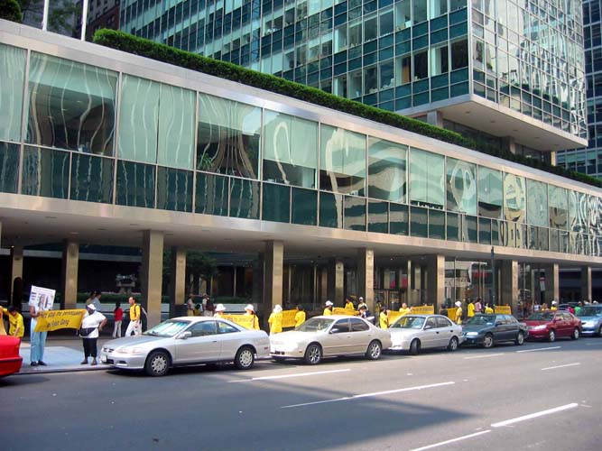 【明慧网2004年8月29日】(明慧记者唐风报道)2004年8月28日,来自全美,加拿大,欧洲和亚太地区的约400名法轮功学员在世界之都——纽约曼哈顿的公园大道上组成了一道“勇气长城”。 “勇气长城”从45街一直延伸到59街,“帮助停止迫害法轮功”黄底蓝字的小横幅贯穿整个“勇气长城”,搭配着其他各式的横幅、展板。49街处是沃道夫酒店,这一著名的酒店历来是政客名流下榻的宾馆。法轮功学员同时在49街处进行了“酷刑迫害真人展”。