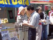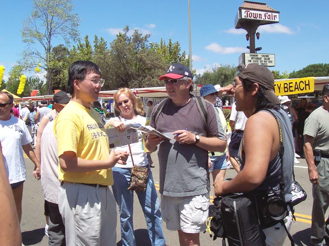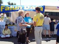 星期天一早,学员们还在示范功法,就有一位男士来到我们的展位,他说他把我们给他的资料从头到尾看了一遍,他今天特地赶来,希望得到资料里提到的《转法轮》一书。学员告诉他可以在书店里买到,或是在网上免费下载,他了解后高兴的离去。
