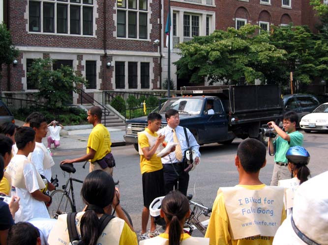 辗转经历了一天半的飞行到达华盛顿后,便到达中领馆前发正念并迎接讲真象自行车之旅到达的小朋友与青少年们。