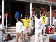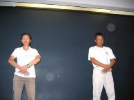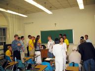 第四天的大型心得交流会结束后,我们搭了十二个小时的巴士前往波士顿,预定参加第五天的大游行。到达波士顿的青年旅店后,店主亲切的和我们交谈,并以波士顿红袜队的棒球衫与我们交换“法轮大法好”的黄色T恤。在随后的两天中,店主都以这件上衣作为打扮,并在第二天向学员们学炼第一、第二套功法。其他学员也把握机会向过往行人讲清迫害真象。