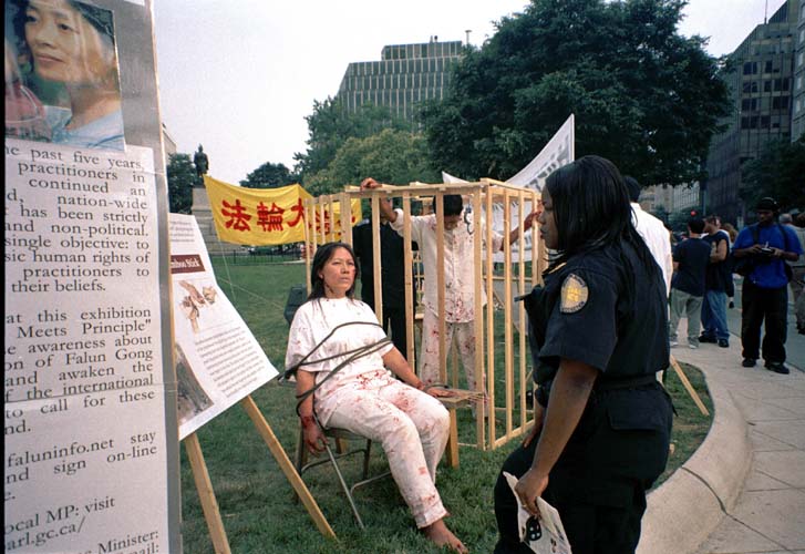 我们抵达华盛顿DC就直奔反酷刑展现场支援,反酷刑展选择的位置都是人潮较多的地点,真人化妆模拟演出十分逼真,吸引很多人的目光。有的人被震惊的目瞪口呆,進一步想了解真象,对江氏集团惨无人道的迫害善良的大陆法轮功学员表示严厉的谴责。有一个黑人女士说:“你们做的很好!”她还多要了一些资料给朋友,还问这个展示还会办吗?她要请朋友来看。一个大陆来的游客表示:他见识过XX党的手段,他想多了解法轮功,得知网路上可免费下载书籍和教功录像,道谢后离去。