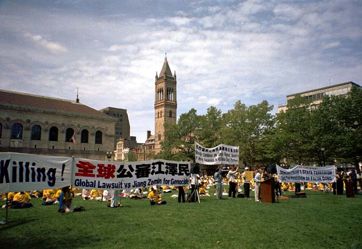 华盛顿DC法会后,7月25日,学员又来到波士顿参加洪法讲真象活动。波士顿举办的游行队伍十分壮观。游行中有悼念在大陆被迫害致死的法轮功学员,接着是反酷刑展示车,气氛庄严肃穆,还有很多横幅;还有介绍大法洪传世界的内容。很多游客拍照留念,目不转睛久久不愿离去,有老外对我们竖起大拇指,有的对我们合十表示恭敬。