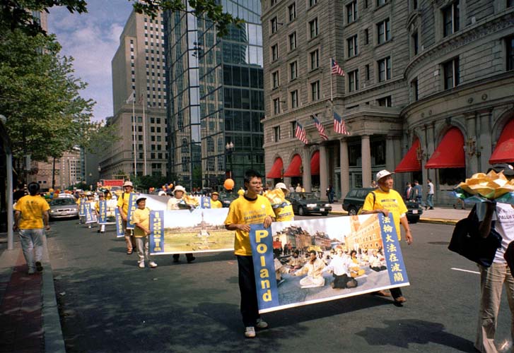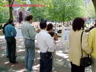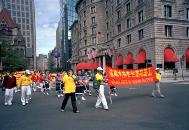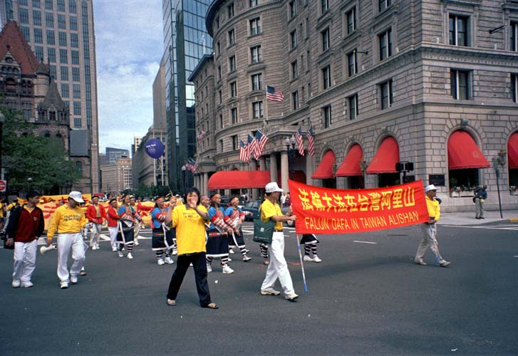 隔天民主党人士要在波士顿开会,许多政要7月25日会進驻到会场附近旅馆,因为美国总统大选在即,世界各大报媒体记者也多,这真是讲法轮功真象的好时机。在波士顿街头游行,百人腰鼓队和唐鼓队排在游行队伍的压轴出发,先头队伍已绕过几条街快一个小时了,鼓队却还没有动,游行队伍实在非常盛大。部分台湾学员以各民族群服饰打扮,代表大法洪传台湾各地,到处受到欢迎。