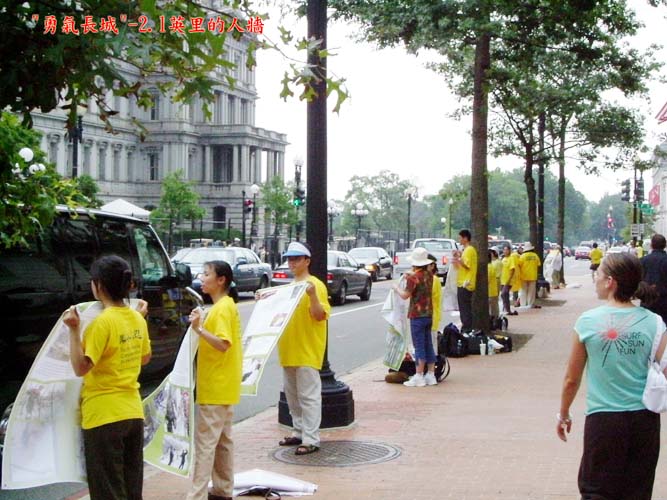 DC法会前的勇气长城,由身穿黄色上衣,手拿横幅和真象图片的上千名各国的弟子参加,在大马路上排成一列,非常醒目,达到很好讲清真象的效果,吸引往来很多行人和车辆的注意,很多人主动要资料,想更深入了解法轮功真象。