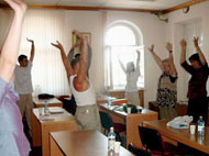 在新闻发布会上我们用电视放了“沙尘暴”影片中一些对法轮功学员酷刑迫害的镜头。所有参加新闻发布会的人都默默的观看,每个人都被影片所描写的残酷事实而震撼。接下来我们现场教了5套功法,很多人都认真的跟着学,有的人还请到了俄文版的《法轮功》和其他真象资料。