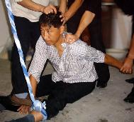 最后我被按到了铁桌下,他们先把我的腿水平固定在地面上,大约四个人勉强按住我的脚(双腿成30度角),使我不能动。剩下的几个人把我的脖子绑在两个小腿肚上,然后开始往下压我后背。我是个大块头,身材又高又胖,当时体重有90公斤,肚子大。平时坐着最多也只能保持上身与下身成90度角。而此时却把我的上身压平与下身成0度角,肚子被压错位挤到两侧,脖子与脚踝骨成一条直线。然后用床单把我的脖子和脚一起固定住,这使我上身不能抬起一点。这时我的面部和腹部同时触到地面,而后又把我双手反绑。