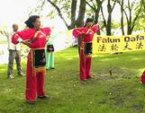 当天还有法轮功五套功法的展示,路人都被传统中国伞舞和扇子舞所表现出的优雅吸引。然而,在后方的横幅则呈现了一个全然不同的对比,除了告诉世人法轮大法的美好外,还诉说着前中国领导人江xx对法轮功的恐怖镇压,十分引人注目。有很多人签名呼吁将江xx送上法庭,为其所犯下的罪行接受制裁。对于现今在世界上发生如此的暴行而且未受到制止的事实,人们都感到很震惊。