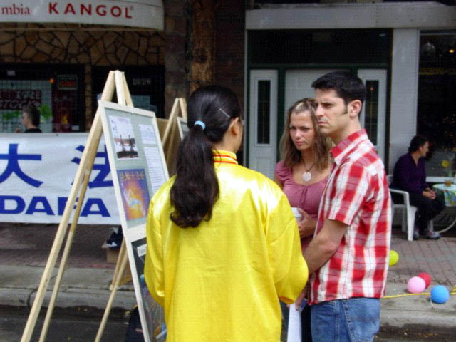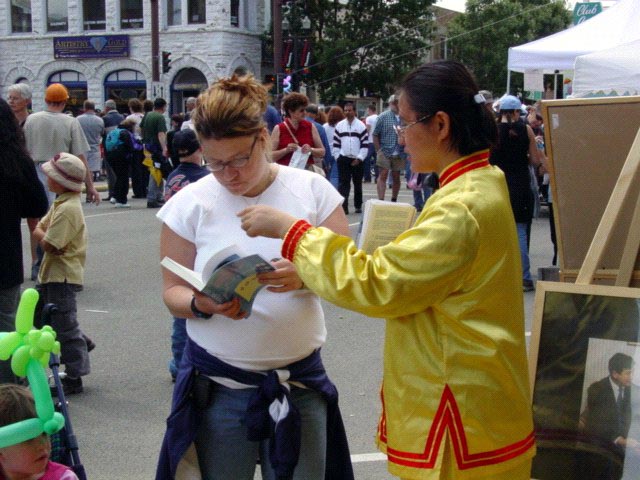 最让人感动的一幕是一对年迈的老夫妇,在看完别的节目后,来到了我们的展位。因为法轮功学员穿着鲜艳的黄色炼功服,他们误以为我们是艺术表演的。因为老大妈步履蹒跚,一位学员马上走了过去,把老大妈轻轻的搀扶了过来。在对话中,老大爷才知道我们是法轮大法修炼者,马上表示要看书学习。而旁边老大妈的手一直和这位学员紧紧的握着,专心致志的听着学员的介绍。