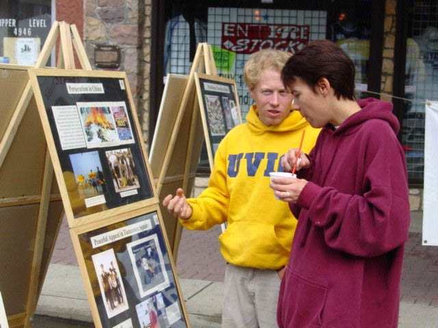 ![]() 从卡尔加里来的年轻人聚精会神听真象 | ![]() 法轮功学员在讲真象 |