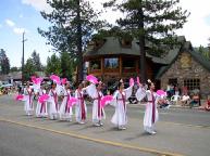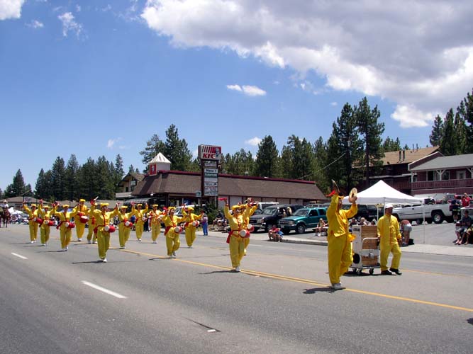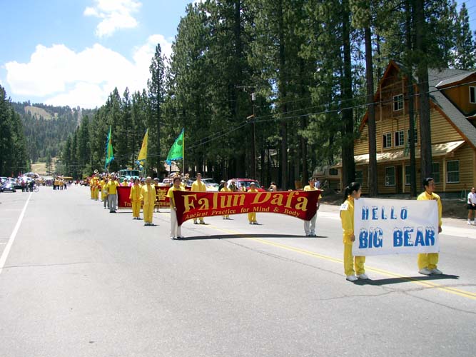 星期日(2004年8月1日)上午,天气晴朗,天高云净,部分洛杉矶法轮功学员经过两个小时的车程,越过重重山道,来到大熊湖畔。这是我们首次参加这里的社区游行。我们的队列有功法演示、唐装舞蹈队以及腰鼓队。排在游行队伍的最前面的是“Hello Big Bear”的问候横幅,接下来是“Falan Dafa” ,“真、善、忍”的大横幅。