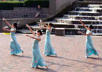 几天的活动中,法轮功学员在炎炎烈日下,不停的炼功、中间穿插文艺表演。法轮功学员表演的歌曲和舞蹈吸引了广场上所有的人,“普度”、“请与我毗邻而坐”的笛子独奏让观众领略了圣洁境界的美好纯正;合唱“为你而来”“得度”带给观众慈悲祥和;加拿大莲花艺术团的四位法轮功小学员表演的傣族舞、扇舞更是令观众连连赞叹,掌声不绝。