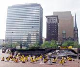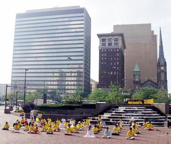 在克里夫兰市的公共广场、司法中心广场及联邦大楼前,法轮功学员以展板图片向人们展示法轮大法在世界的洪传、法轮功学员受迫害的真象以及在过去五年中和平理性反迫害的历程。