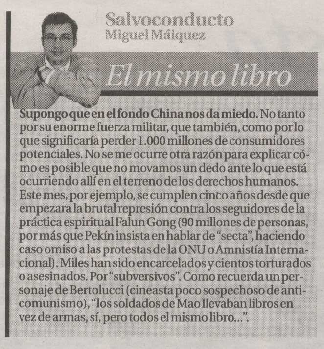 有文章中写到“……中国依法取缔法轮功组织完全正确,大快人心。……”,我想请教一下:是用那一条法来取缔的?又中国宪法上有保障人民信仰自由与上访的权益,请问哪一条法律能与国家根本大法(宪法)相违背的?再者“大快人心”大概是指江××与其党羽吧!绝非是广大而又善良的中国平民百姓吧!