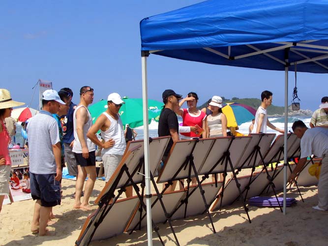 8月4日,他们已经到达束草市落山海上浴场,这是东海岸线最大的旅游点之一。连日来,学员们每到一处,当向有关部门讲清法轮功真象并申请活动场地时,各有关部门明白了真象并听说是为了人权问题,都是热情相待,并积极帮助安排活动场地。