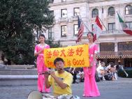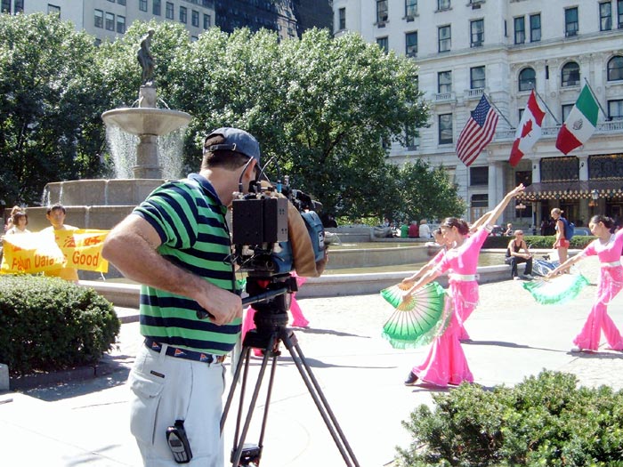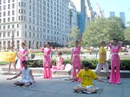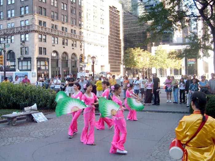 2004年8月29日星期天,盛夏八月的纽约中央公园人潮熙攘。休闲的人们和冲着美国共和党代表大会而来的人们混杂在一起,很是热闹。在公园的东南角進行的我们的街头表演吸引了大批的人们驻足观看。这是一群穿着鲜艳服饰的女学员们在中国传统音乐声中翩翩起舞,吸引着大批行人。她们时而表演扇子舞、傣族舞,还有法轮功的五套功法演示,以及黄土高原风格的腰鼓表演。看到此景的其他地区的学员也纷纷加入到了表演和派发材料的行列。