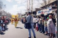 中午12点时,迎春游行开始了,当法轮功学员的队伍出现时,主持人说:“这是法轮功学员,他们的信仰是‘真、善、忍’。”