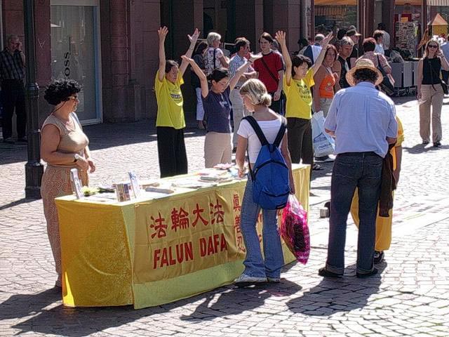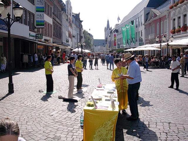 时值周末,下过一周雨的天空格外晴朗,行人如流。伴随祥和的炼功音乐,法轮功学员手起处舒缓圆润,优美流畅,令行走的路人不禁放慢了脚步。在这座漫山遍野种植着甜美葡萄的山谷中的小城,有来此过周末的德国各地游客,法国人,意大利人,奥地利人,波兰人,英国人,挪威人,也有来自北非,南美的,当然也少不了中国的游客。