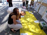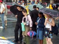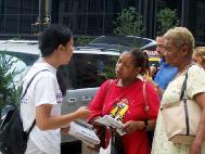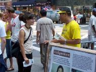 自八月以来,在曼哈顿商业中心的大街小巷,常常能看到身穿黄色T恤衫的法轮功学员,有的演示功法、有的向路人讲法轮功的真象,有的散发真象材料。在人流密集的地方还可看到他们在做酷刑展和图片展。有很多路人会停下来观看和了解真象。有越来越多的纽约人了解了法轮功的真象。