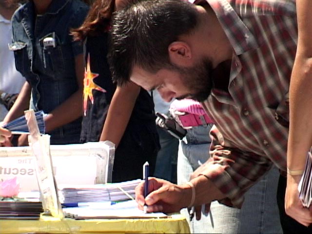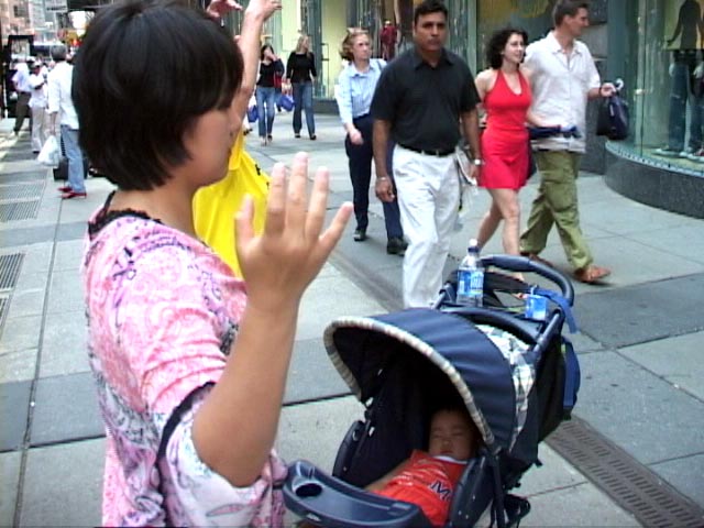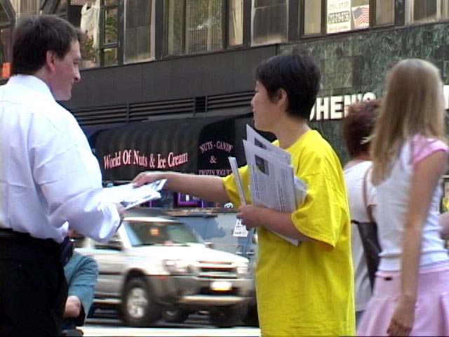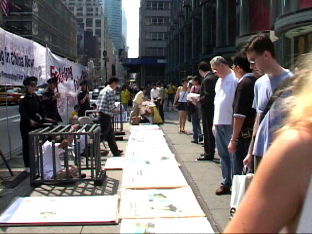【明慧网2004年9月14日】911事件三周年之际,美国尤其是纽约民众纷纷举行各种活动悼念911死难者,反对恐怖主义。纽约市长彭博发表电视讲话,呼吁全球反恐,确保911事件不再发生。在纽约曼哈顿的街头,各族裔的法轮功学员随处可见,成为纽约911活动中的另一景观。他们在呼吁制止中国江氏国家恐怖主义。他们通过反
