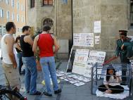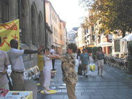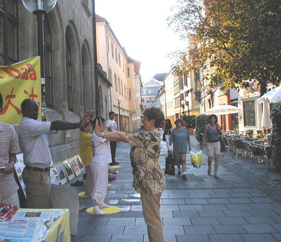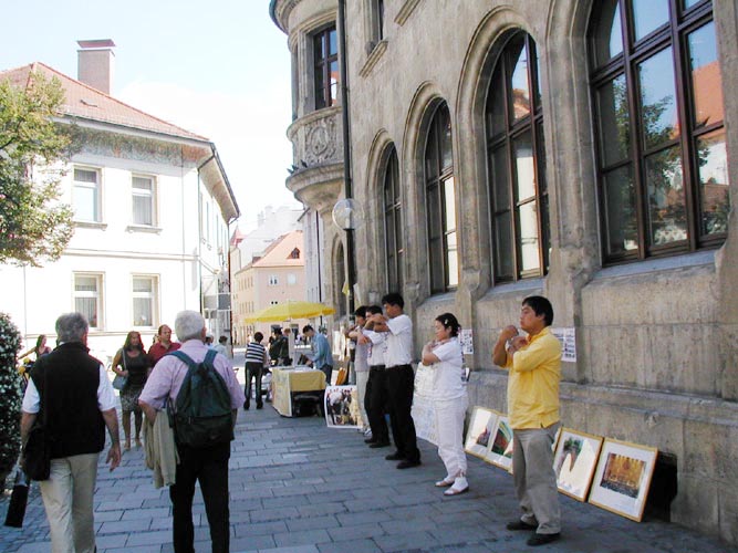【明慧网2004年9月16日】2004年9月4日,德国拜恩州部分法轮功学员在雷根斯堡举办了法轮大法信息日活动。信息台和酷刑迫害演示所在的位置在一条比较僻静的街道上,尽管如此,几千份资料还是在几小时内就被行人拿光了。陆续来到的学员们,展示功法,派发真象资料,征集签名,片刻不闲。