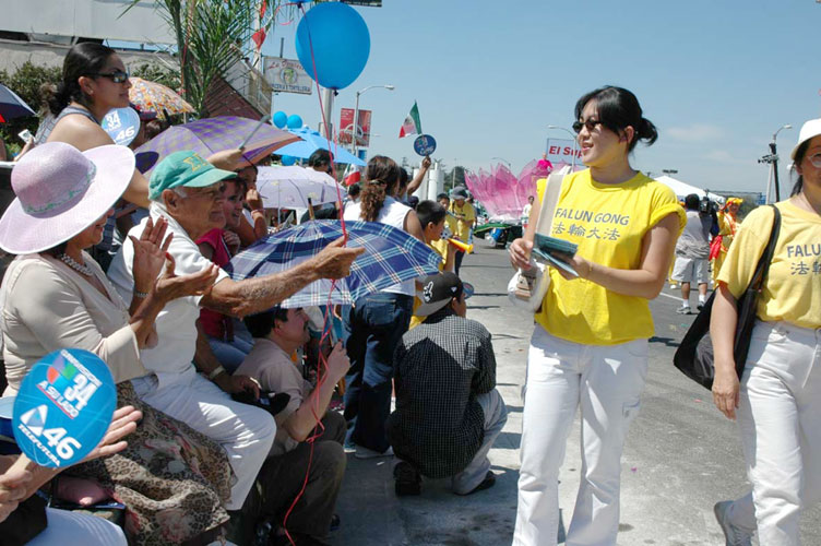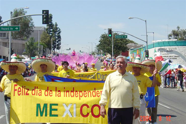【明慧网2004年9月16日】2004年9月12日,部分洛杉矶法轮功学员参加了拉美族裔举行的每年一度的墨西哥独立日庆祝大游行。据组织者估计,约有200个团体参加了此次活动,现场观众人数有十几万人。这是当地今年拉美族裔举行的最大规模的庆祝活动,洛杉矶法轮功学员今年首次申请参加。