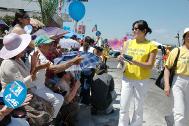 主持人介绍说,法轮功学员给这个节日带来了不同的文化。“法轮功是一种平缓的功法,可以给人们带来健康。他们真的在实践每天、和每星期在介绍会的教功都免费。……两位年轻的女子扬起了墨西哥的旗帜,她们以此来表示愿意和墨西哥人一起欢庆这个节日。……打坐、莲花,多美啊,真正的艺术。法轮大法,古老的能够回升人们身心的功法。”