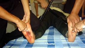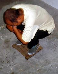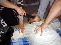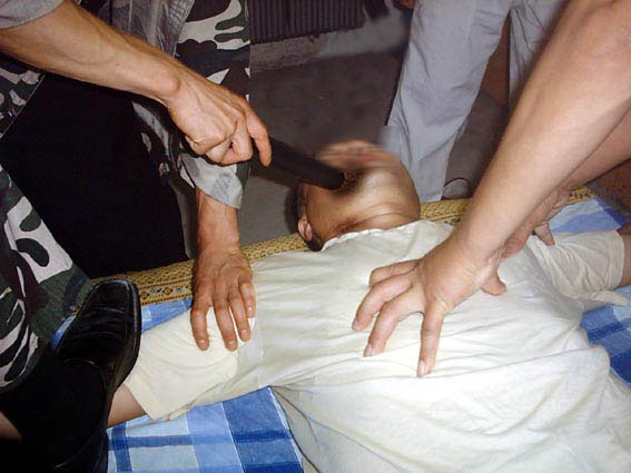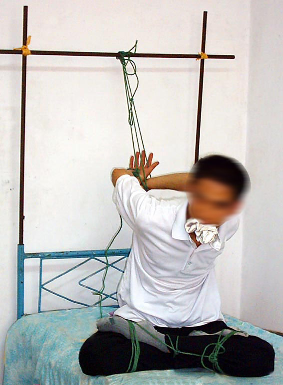 2002年12月末,张士“小楼”3楼9房,在主管迫害的院长程殿坤、恶警史凤友的指使下,4、5名恶人将刘宪勇(男,28岁,法库学员)的两腿按住,强行做“反盘”打坐姿势,并用绳子捆紧。又把他两臂猛背过去,用绳子绑住双手,另一端吊在床栏上,拉至极限,嘴里堵上抹布并用胶带封紧,防止喊叫。这样每次3小时,每天4、5次,折磨数日,刘宪勇本就瘦弱,常常胃痛,加之在普教四大队4个多月的高强度奴役劳动(糊梳子盒、插皮子)身体更显单薄,时间长了,手被勒得不过血,双腿剧痛,以至后来两脚肿胀无知觉,无法独立行走,上厕所需人搀扶。