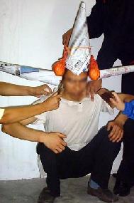 “帮教人员”用纸折成高帽,两边分别系一只水果戴在法轮功学员头上,旁边“帮教人员”用梳子梳被迫害学员的眉毛,污辱人格。还用纸筒对其耳朵喊骂大法的话。坚持信仰的法轮功学员因长时间睡眠短缺和体罚,已被折磨得精神恍惚,耳边大声的喊骂声震得头部和心脏受不了。2001年初,法轮功学员刘建光(沈阳市大东区)曾被用此方式折磨。