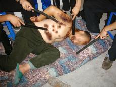 2002年8月3日12点左右,宋百顺把法轮功学员张国义叫到队部,当时屋地中间铺了一床棉被,周围站了四五个普犯,桌子上放了三根充足的电棍,墙上还挂着三根。宋百顺问张国义有什么想法,张国义说按“真善忍”做好人没错。宋百顺立即命令几个普犯扒光张国义的上衣,按倒在被子上,双手反背铐牢。宋百顺和大队长陈伟一前一后坐在椅子上,用2根电棍不停的电张国义的嘴、腋下、腹部和胳膊,宋百顺边电边骂。张国义感到前胸紧缩,心象往出揪一样,整个身子剧烈颤动,在电击过程中手铐深深嵌入肉里,手腕流血……后来电棍没电了,他们又换了两根接着电,在场的另一队长魏茂金(30多岁)狂叫:“再不行往肛门里电!”当时在场的还有队长潘金维(40多岁)。此次电棍电击施暴近3个小时,张国义的嘴肿得说不出话,腋下、腹部和胳膊等处大面积灼伤起鸡蛋大的血泡,整个上身几无完肤,手腕肿得呈青紫色。看到张国义被迫害的惨状,六大队的普犯说:“你们法轮功都是好人 ,队长下手怎么这样狠?”