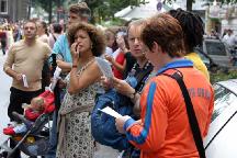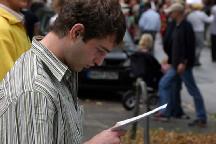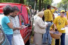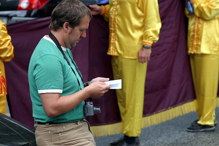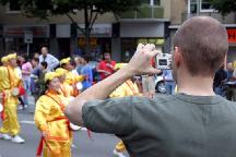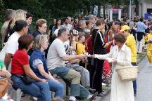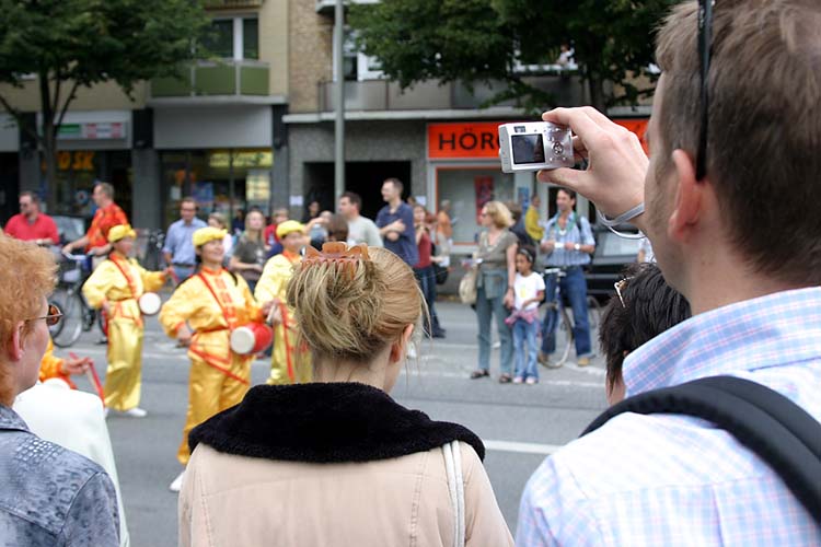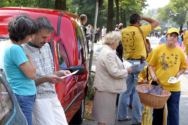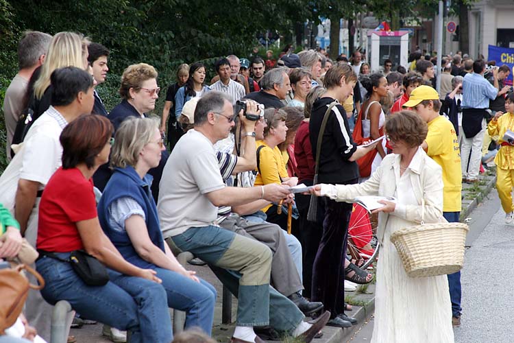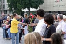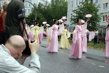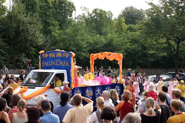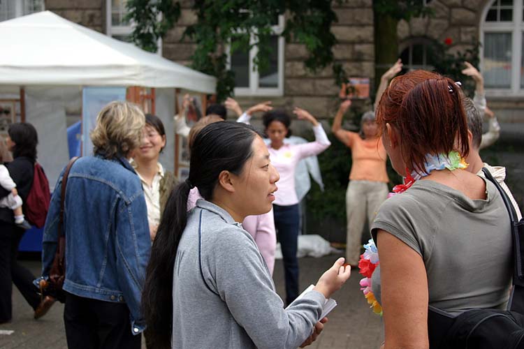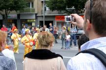 学员在汉堡大学内的两个展位上展示了记录法轮大法洪传的图片,并参加了在11日举行的彩车游行,学员展示的法轮功功法、舞蹈和腰鼓表演赢得了沿途观众的阵阵掌声,彩车游行评比获得第三名。人们非常愿意了解法轮功真象,派发资料的学员忙个不停。