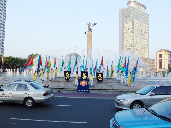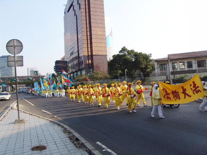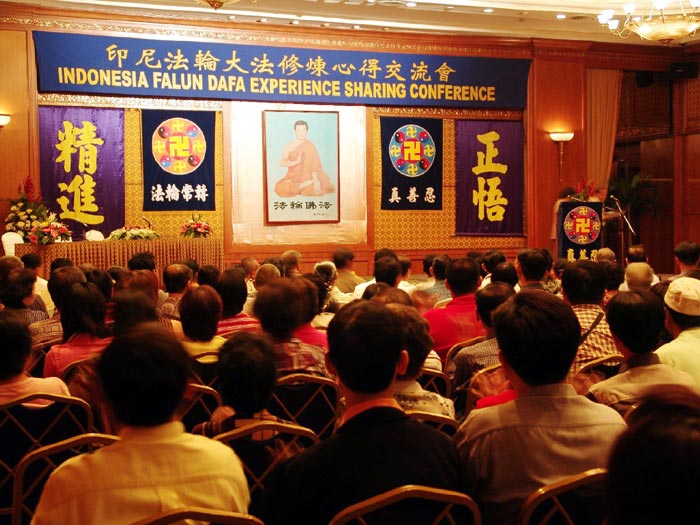 印尼旅游局局长向法会致贺,前国家政协副主席则是第一次出席法轮大法修炼心得交流会。台湾法轮大法学会给法会致以贺电:“在此邪恶猖獗,黑白不分的时世,印尼法轮功协会突破艰难的环境,顺利召开2004年全印尼的修炼心得交流会,祝大会成功。让更多的世人了解法轮功受迫害的真象,使学员真正符合正法时期的要求,做一个能走出来证实法,助师正法及救度众生的正法时期伟大弟子。”会场两边“正悟”“精進”两大型幅条,非常耀眼,会场布置庄严神圣。