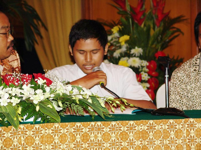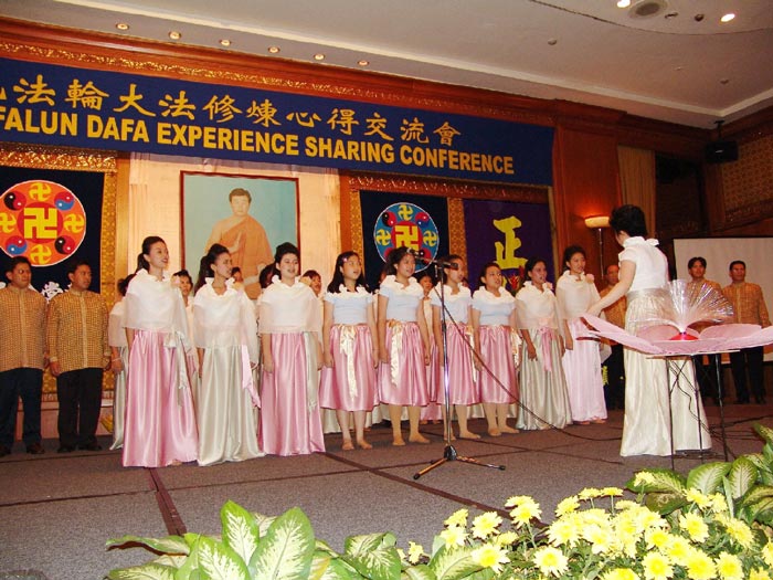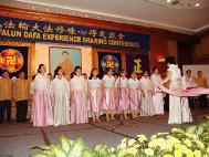 发言的学员来自各地,巴厘一间盲人学校的学生朗诵《论语》,校长赠送奖章给印尼佛学会表示感谢,由会长许文泰接受。此次法会的文艺节目,内容相当丰富,有唐装舞蹈“普度”,有雅加达和棉兰法轮功学员临时组成的合唱组,泗水学员穿起各地传统盛装,用快板赞颂“法轮大法好”。
