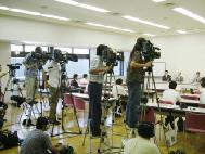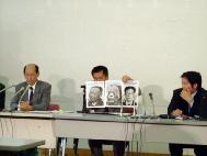 ![]() 记者招待会现场 | ![]() 学会成员就记者关心的天安门自焚事件,展示该事件中真假三个王进东的照片 | ![]() 记者在阅读招待会提供的法轮功真象资料 |