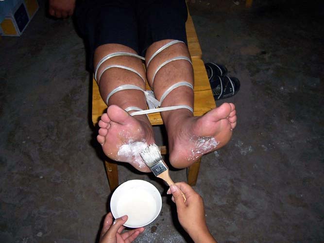 我绝食第11天,恶警孙红利把我抬到一间没有人的库房,在他的指使下我被绑在一个长条椅子上,恶警们说:“一会儿有你好受的。”他们让看守所的犯人把我的鞋、袜子脱了,然后用小刷子沾上火碱和水刷我的脚心,这种火碱会把人的皮肤烧烂的,可见他们是多么的没有人性。刷了一会儿觉得没有他们预料的效果,后又指使饶阳县一名叫志刚的犯人拿打火机烧我的脚心,断断续续烧了我半个小时,把我的脚心烧起了2个枣一样大的泡。还往我的嘴里灌特浓的盐水,弄得我嘴里都是盐粒。整个迫害过程我都咬牙忍受着。那种痛苦、折磨让人无法承受,这都是在恶警孙红利的指使下進行的,他还大叫:“你不吃饭,不吃饭你死了马上火化。”