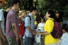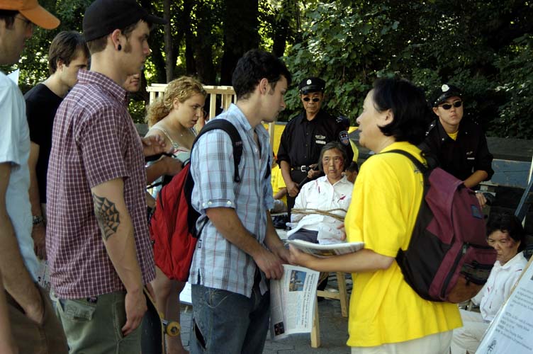 【明慧网2004年9月2日】在美国共和党大会之际,法轮功学员在纽约多处连续一周来举办反迫害酷刑展,引起世人广泛的关注。在曼哈顿中央公园旁的酷刑展前,几天来在匆匆忙忙的人流中,很多路人被酷刑所震惊,纷纷签名谴责迫害,寻求国际和平,不能让恐怖在中国继续下去。
