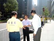 不久,在30多个穿制服或便衣的警察,20个媒体记者的簇拥下,三个重要人物快步行进在百老汇街头,一位穿着印有“停止迫害法轮功”字样的T恤衫的法轮功学员此刻正站在路中间发材料。迎面碰上这三个要员后,这位法轮功学员给中间的和他身旁的要员各递了一份真象材料,所有媒体都拍到了两名要员接材料的镜头。据知情人士介绍中间的要员是纽约市市长麦克-彭博先生(Michael Bloomberg),市长旁边接材料的是州长帕塔基先生。